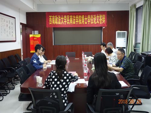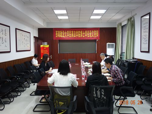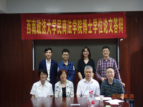 2018年5月26日上午9点,2018届婚姻法博士生博士学位论文答辩在西南政法大学渝北校区致理楼三楼民商法学院会议室举行。2018届婚姻法博士生董思远、陈钊两位同学首先分别简介自己的论文写作情况、主要内容及主要创新点等,接着答辩委员的专家们针对两位同学的论文分别提出相关问题。然后,两位答辩同学带着专家们对各自论文的提问离开该会议室,经过相关问题回答的思考准备后再回到会议室进行答辩,最后两位答辩同学均顺利地通过了答辩。在此我们向他们表示热烈的祝贺!