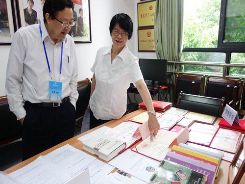 第二阶段,评估专家顾功耘教授参观“重庆市陈苇劳模创新示范工作室”。在工作室主任陈苇教授、民商法学院李兆玉副院长以及婚姻法教研室朱凡副教授的陪同下,顾功耘教授莅临该工作室,陈苇教授简要地向他介绍了工作室的主要成果:一是人才培养、教学改革的成果,获得重庆市教学成果一等奖,在全国三大出版社主编出版了11部《婚姻家庭继承法学》等教材,创立以研究生为主讲人的“家事法沙龙”且自2009年以来已经举行了20多期;二是科学研究的成果,荣获国家级《国家哲学社会科学成果文库》奖的著作成果,主编出版“家事法研究学术文库”系列丛书18部和“外国法译丛”译著8部等科研成果;三是立法咨询、立法建议的成果,先后参加国家立法和地方立法,应邀向全国人大法工委、最高人民法院、最高人民检察院、中国法学会民法典重点项目课题组及重庆市人大法工委等单位提交多份立法咨询报告和立法建议稿;四是促进国际学术交流的成果,近年“以文参会”,先后到英国、荷兰和法国出席家庭法国际研讨会,在会上发言讲述中国观点。尤其是2017年7月陈苇教授在“第十六届家庭法世界大会”上当选家庭法国际学会副主席;五是法律咨询、法制宣传服务,“西南政法大学婚姻家庭继承法律咨询公益服务站”的“在线法律咨询”访问量已达2000多人次;李俊副教授作为总队长带领师生多次参加重庆市总工会和教科文卫体工会组织的“尊法守法 共同筑梦,农民工法制宣传活动”,受到社会群众的好评;六是获奖情况,工作室所获得的国家级、省部级的集体荣誉奖状和个人荣誉奖状。顾功耘教授对以上工作成绩给予充分的肯定,并希望在陈苇教授的带领下工作室成员取得更好的成绩,今后继续为民商法学院的学位授权点建设工作做出积极的贡献。